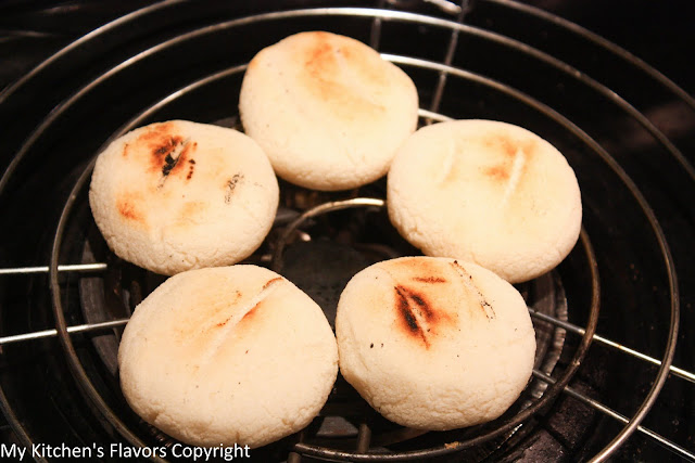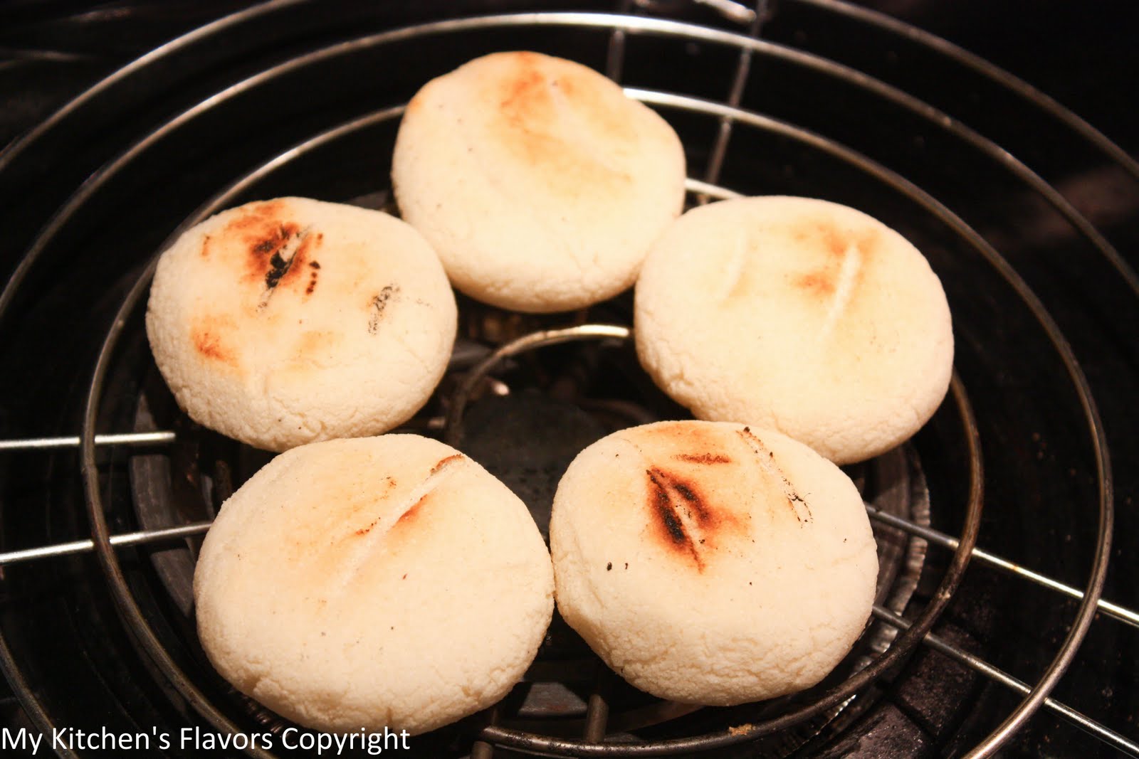 Heat a "Parrilla" wire grill to medium heat, and place the arepas over the heat of element. Cook for 5 minutes on each side or until they're lightly golden brown. These arepas are served with fried chicken, Roasted chicken, carne asada, and many other Colombian dishes.