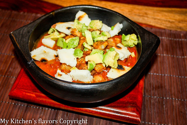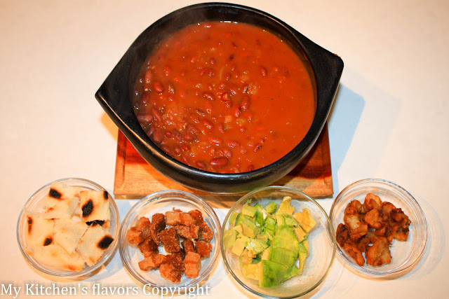 Place some rice in soup bowl, pour the soupy beans to 3/4 of the bowl. Serve the chicharron (porkbelly), avocado, arepa bits and plantain in small bowls and lime wedges, so everything can get mixed on the table.