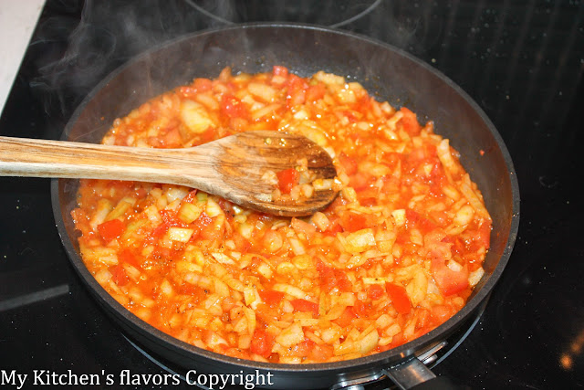 In a fry pan, heat the oil and add the achiote, mix well. Add the scallion and fry for 3 minutes, add the dice tomatoes, cumin, salt and pepper and cook for 5 minutes.
