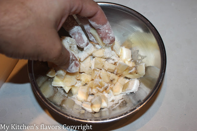 In a bowl, salt and pepper the pieces of pork belly and sprinkle 2 tablespoons flour, mix well. Fry in abundant oil at 250 degrees until brown and crispy.